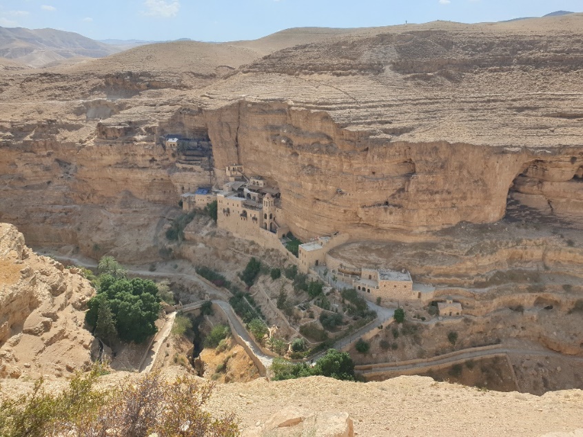 Für die weitere Fahrt in Richtung Betlehem hatte uns unser Reiseleiter ein ganz besonderes Highlight versprochen. Mitten in der Wüste hielt der Bus an und wir gingen eine schmalen Pfad entlang zu einem Aussichtspunkt, von wo aus wir einen wundervollen Blick auf das Kloster St. Georg hatten. Das Kloster ist in die Felsen der Wüste hineingebaut und hat bei allen einen bleibenden Eindruck hinterlassen.